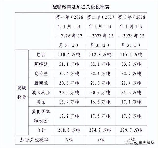 再看关度,更是让牛肉出口商难以承受。按照,进口牛肉正在配额范畴内的,还能按现行合用关税税率缴纳关税;但一旦跨越配额数量,从达到配额的第3天起,就要正在现行关税税率的根本上加征55%的高额关税。
