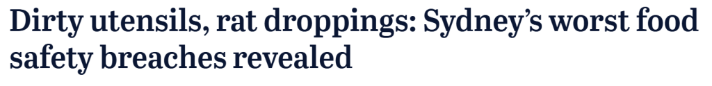新州食物办理局最新的“Name and Shame”名单显示,Blacktown市议会辖区的受罚企业最多,自1月来已有33家餐馆被罚款。涉嫌严沉违反《新州食物法》的企业还可能被新州食物平安局告状,上一财年共有4案件了案。Penrith的越南快餐连锁店Roll’d被判10项成立,包罗未采纳一切可行办法防治害虫以及未采纳需要步调防止食物被污染,并被罚款33500澳元。